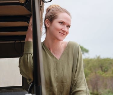 Neutrals are your best friend on safari. Shades like olive, tan, cream, sand, and soft browns are comfortable, practical, and photograph beautifully. They help you feel part of the landscape without standing out.